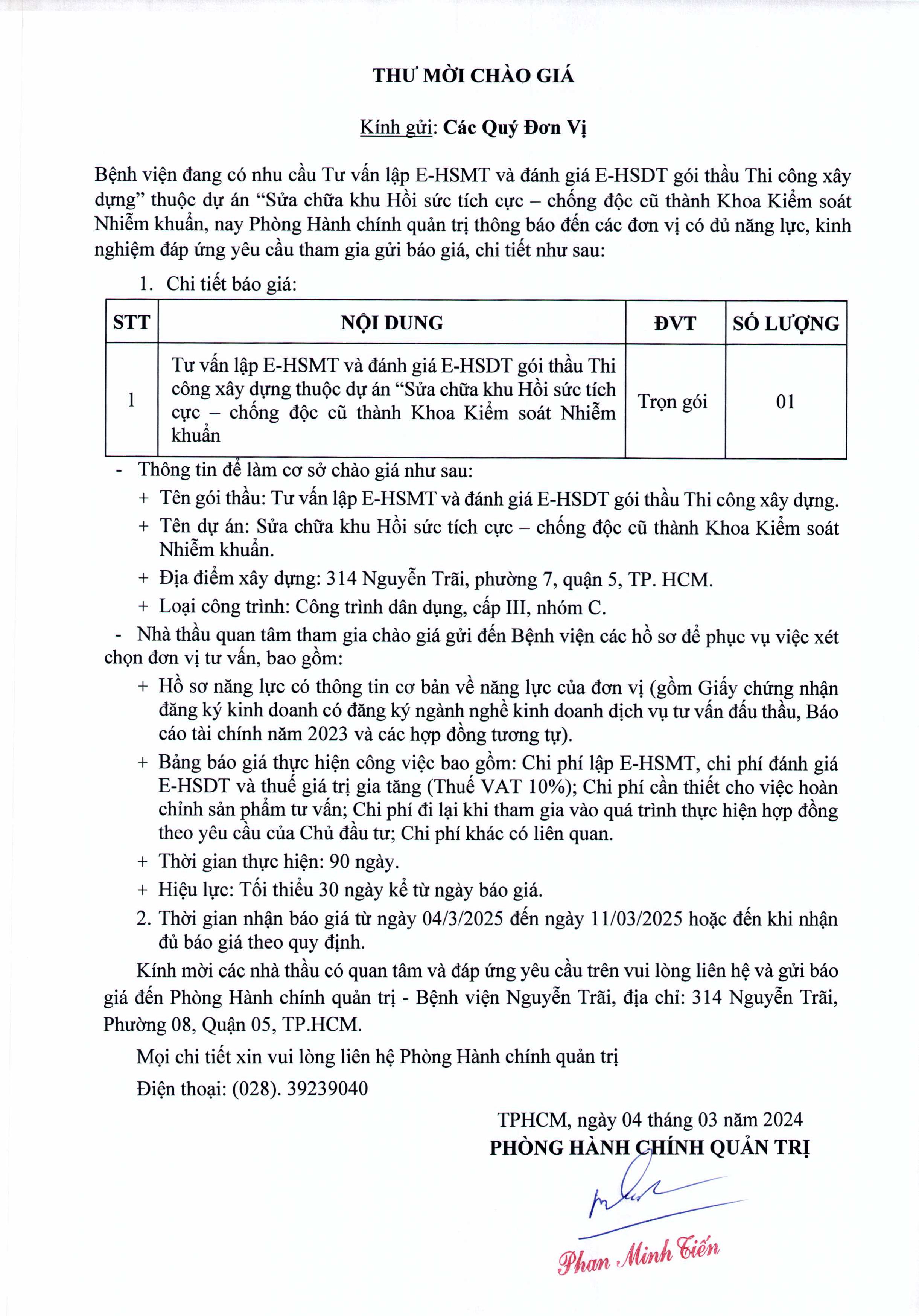 Thư mời chào giá Tư vấn lập E-HSMT và đánh giá E-HSDT gói thầu thi công xây dựng thuộc dự án ” Sửa chữa khu Hồi sức tích cực chống độc cũ thành khoa Kiểm soát chống nhiễm khuẩn