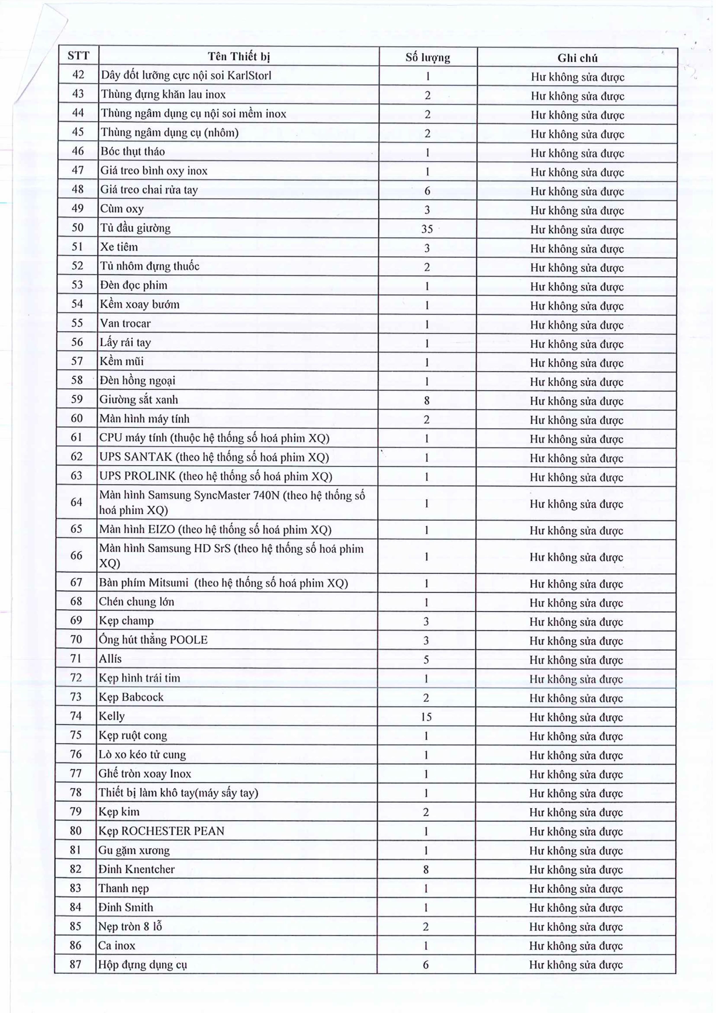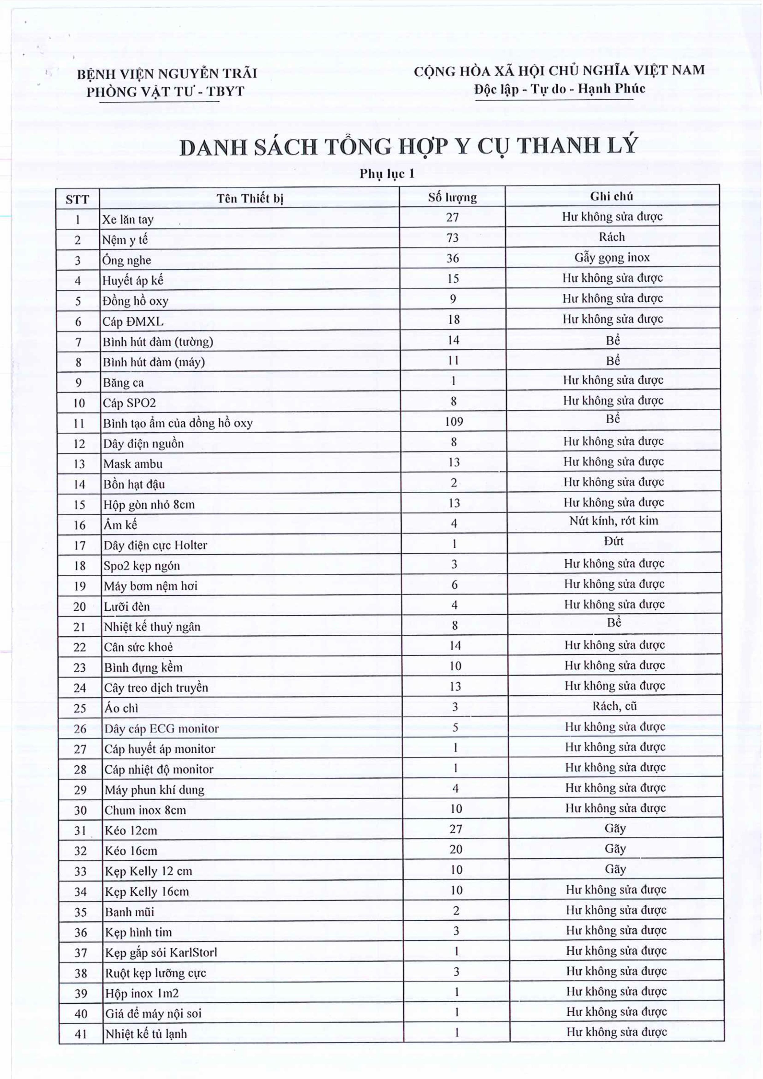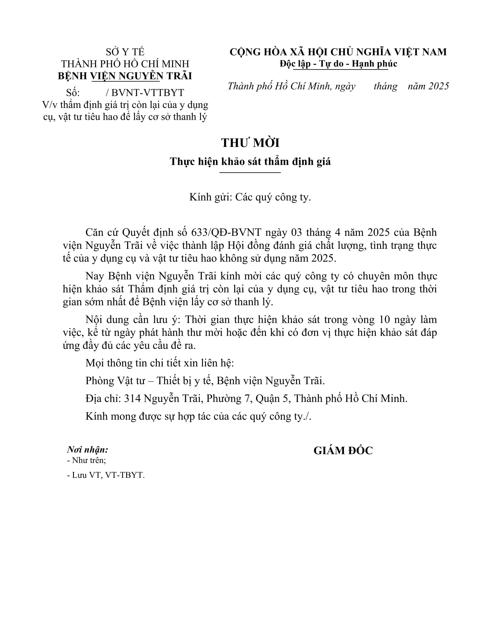 Thư mời chào giá V/V thẩm định giá trị còn lại của y dụng cụ, vật tư tiêu hao để lấy cơ sở thanh lý