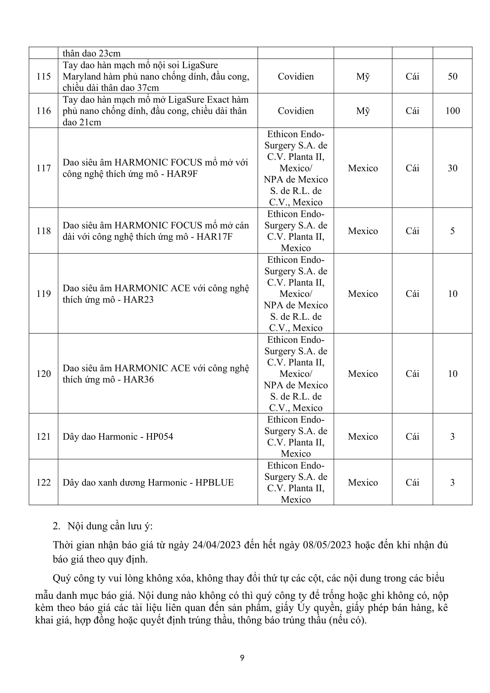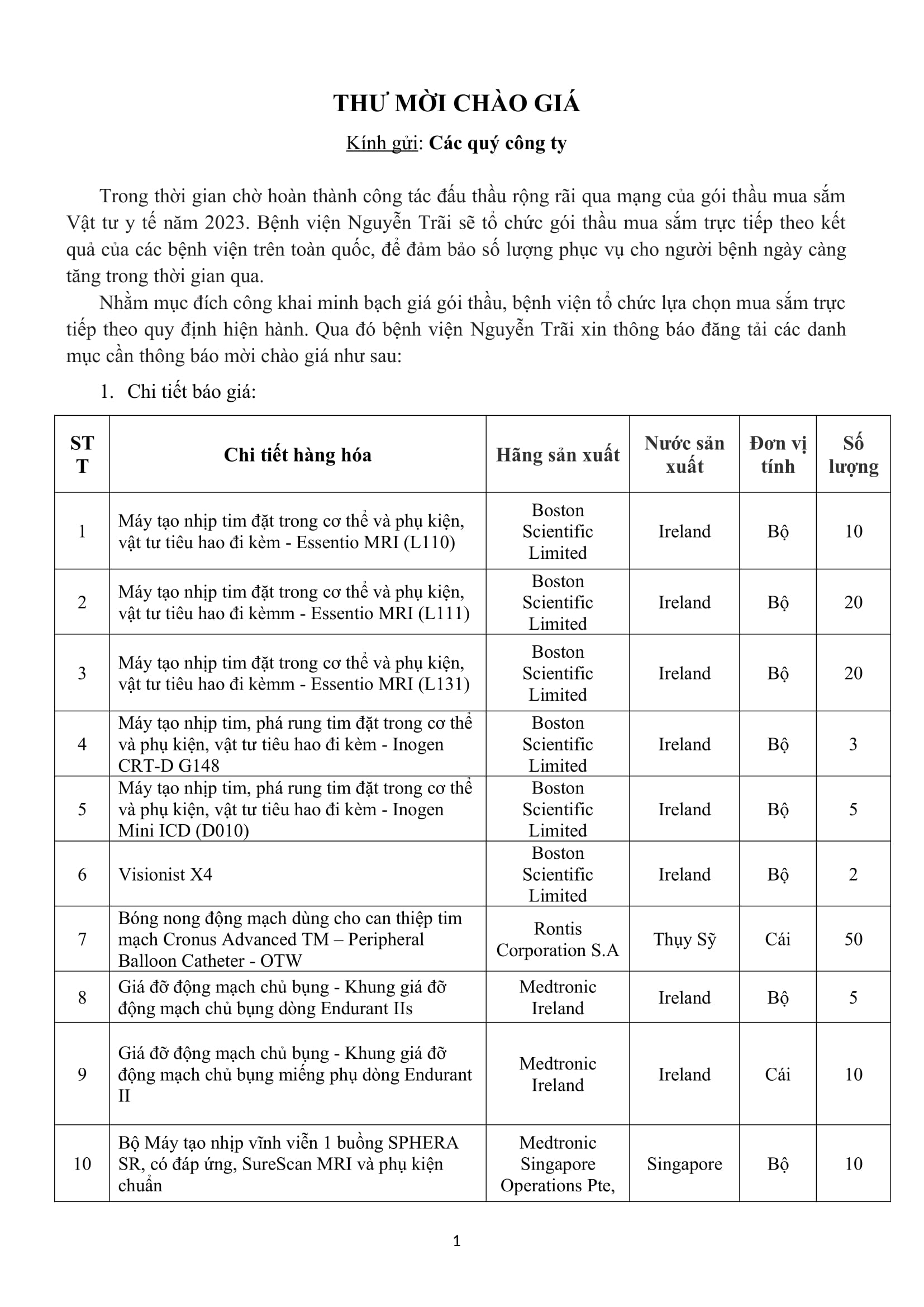 Thư mời chào giá vật tư y tế phẫu thuật chuyên khoa tim mạch và phẫu thuật thần kinh sọ não