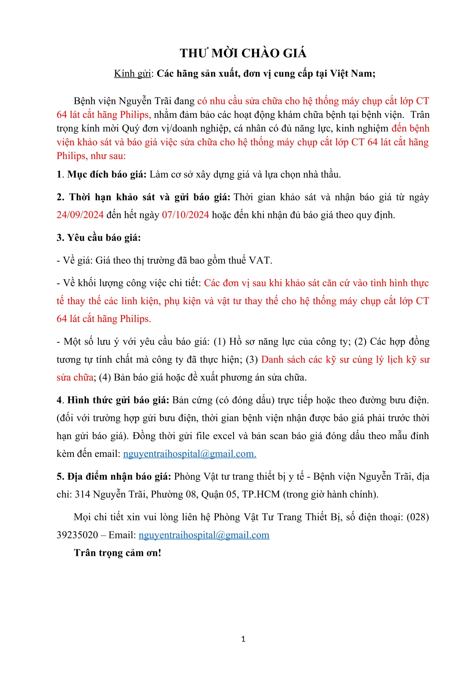 Thư mời chào giá việc sửa chữa cho hệ thống máy chụp cắt lớp CT 64 lát cắt hãng Philips