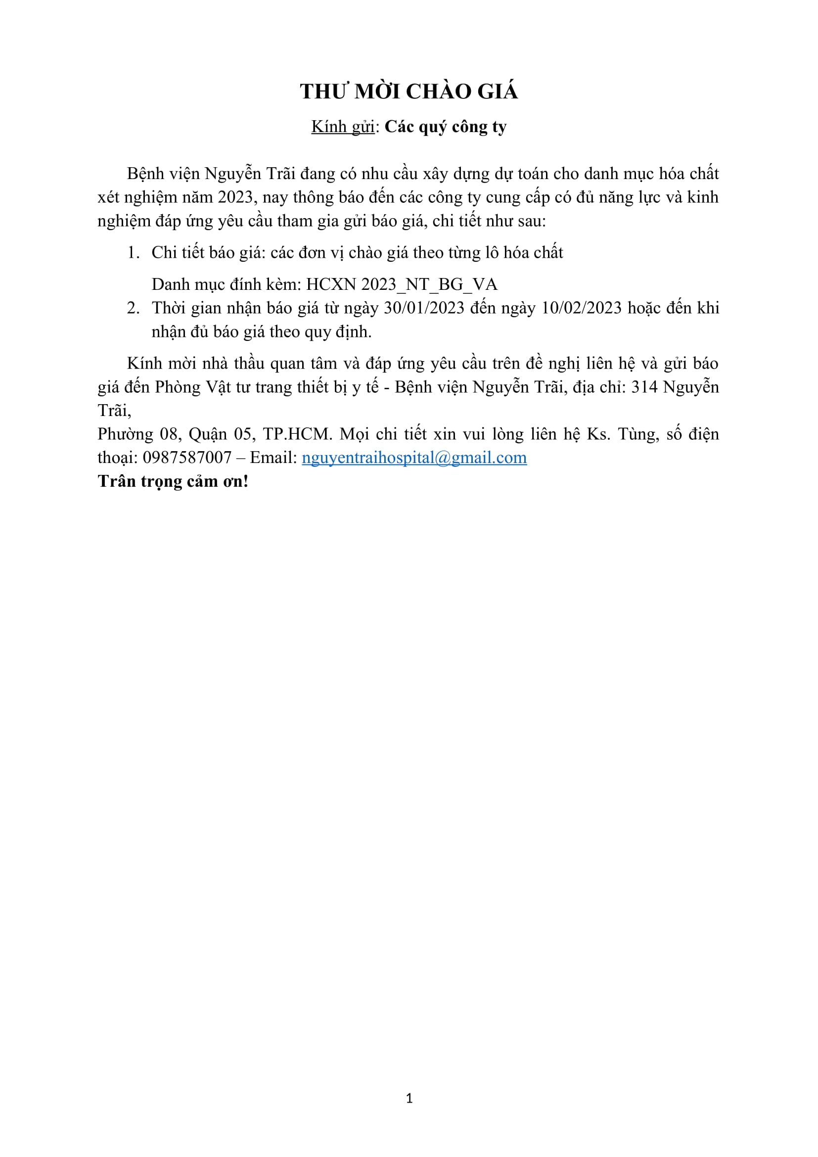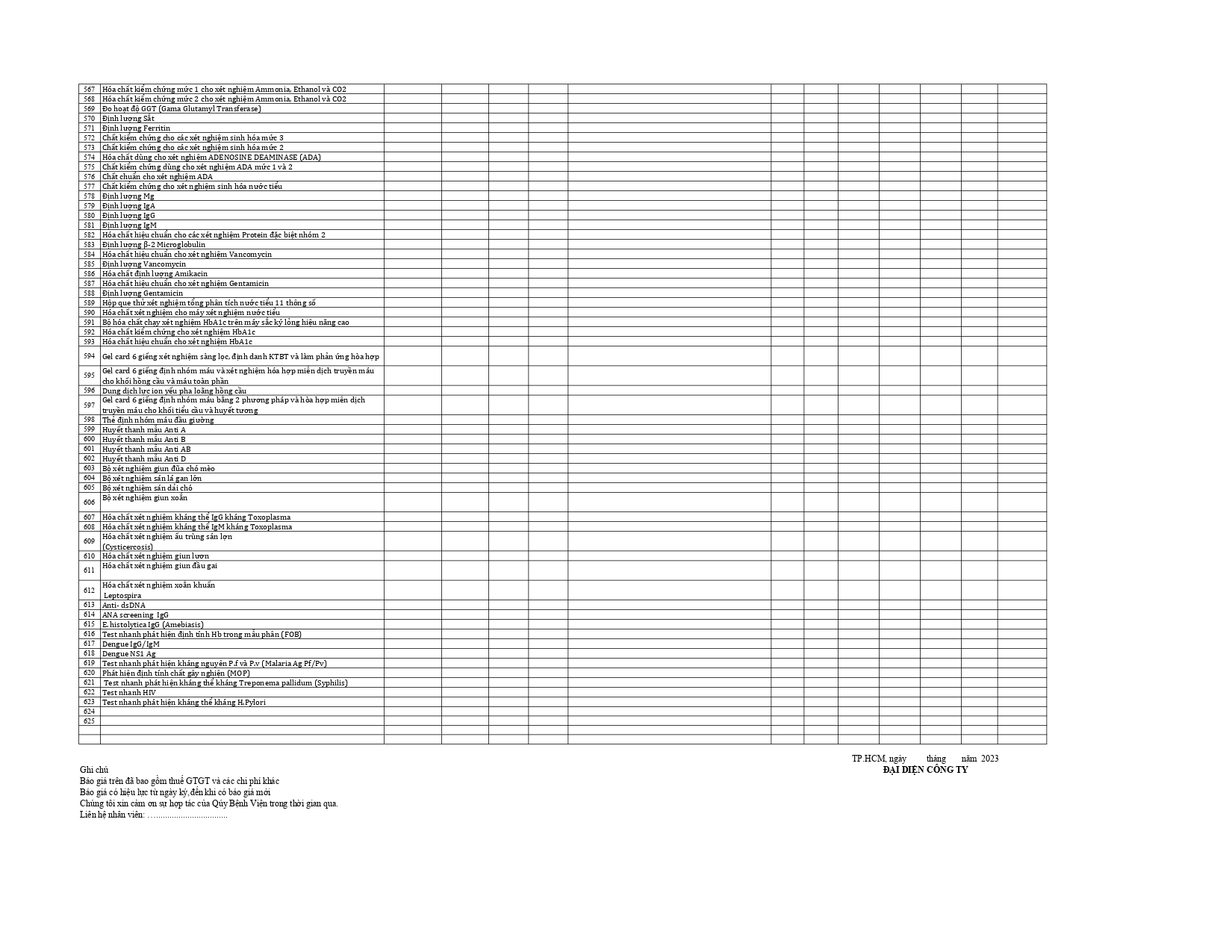 Thư mời chào giá xây dựng dự toán cho danh mục hóa chất xét nghiệm năm 2023