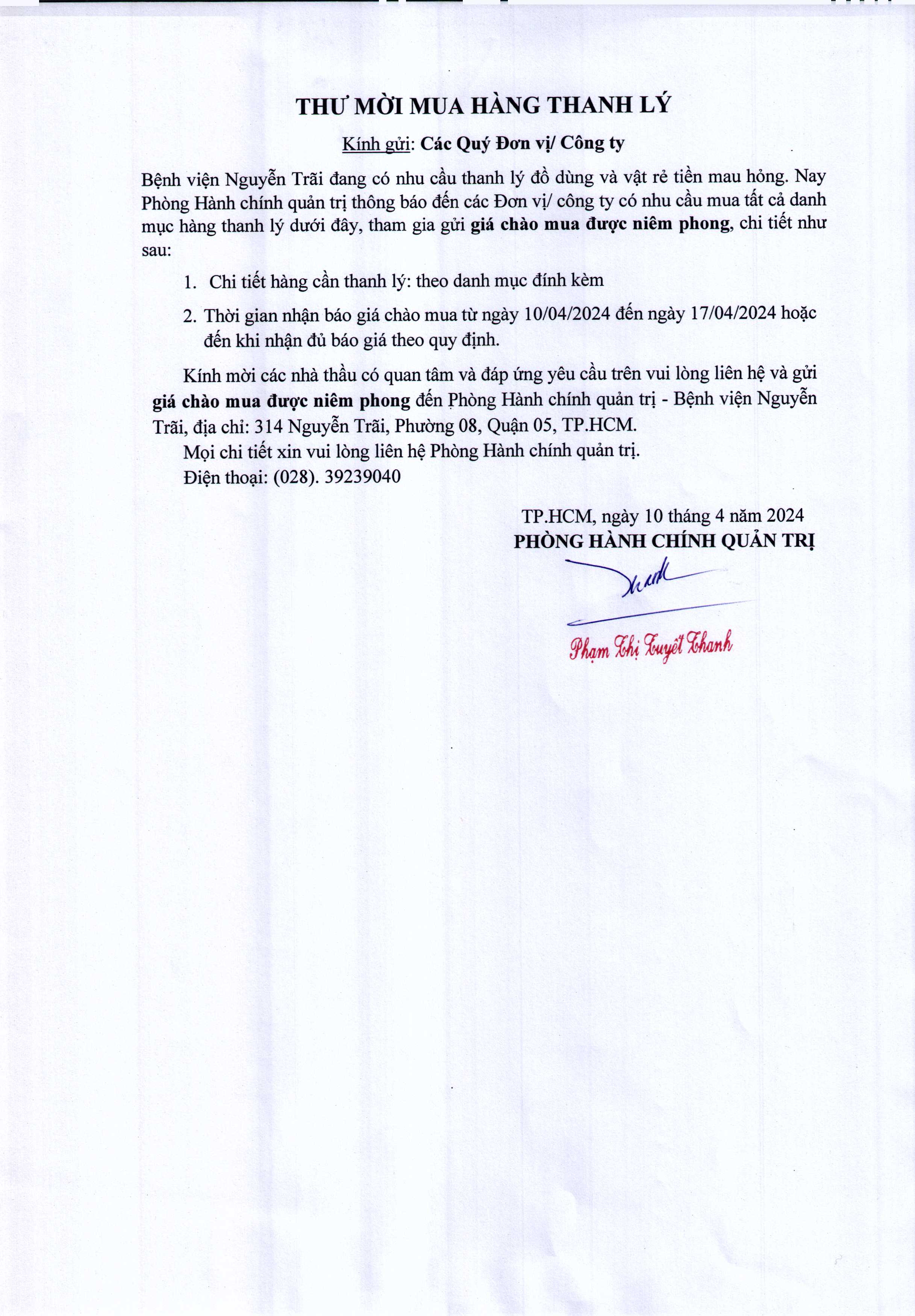 Thư mời mua hàng thanh lý