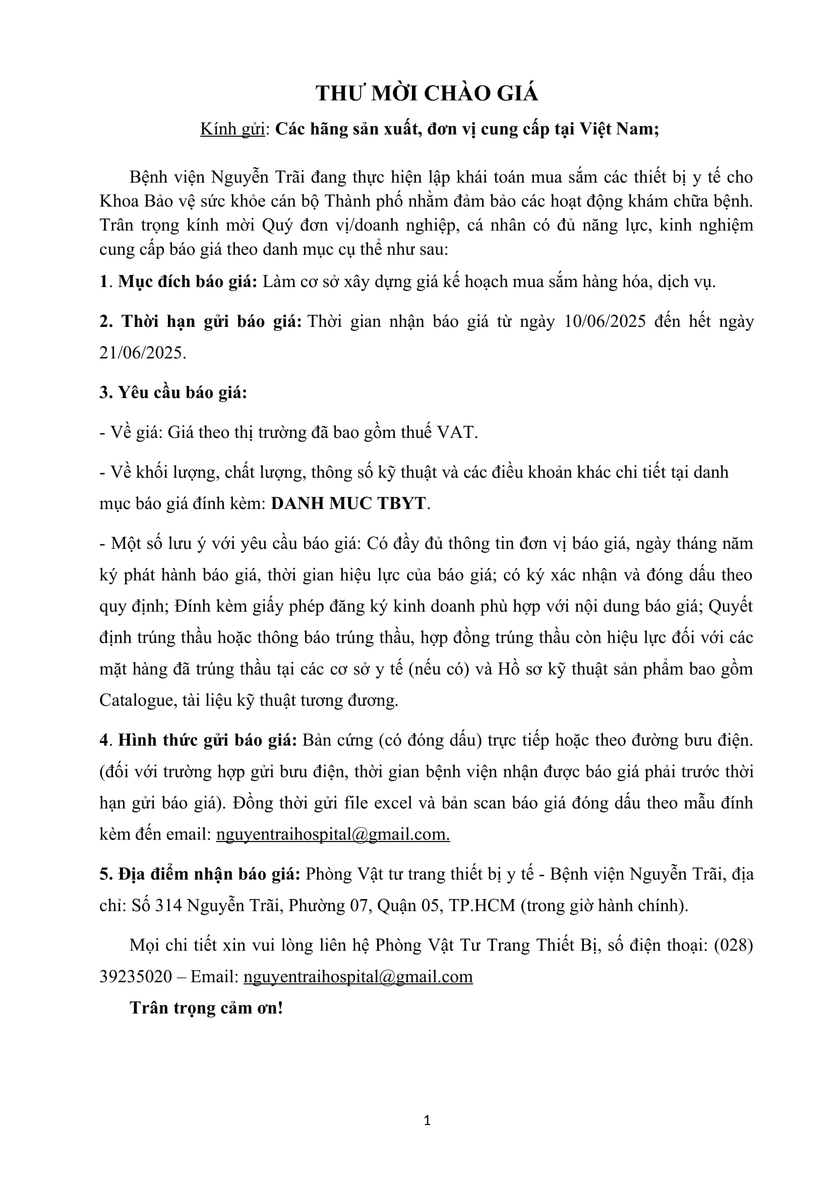 Thư mời tham gia chào giá thiết bị chăm sóc sức khỏe cán bộ năm 2025